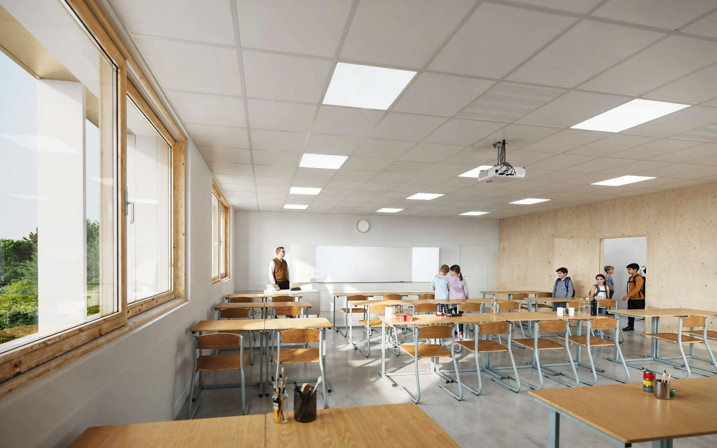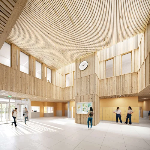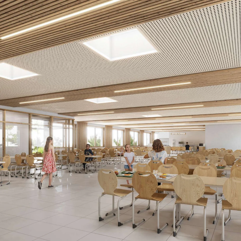 Conçu pour le Départemental de la Sarthe selon une démarche bioclimatique, il bénéficie de protections solaires fixes, de toitures végétalisées et d’équipements énergétiques performants. L’organisation des espaces favorise la lisibilité, la lumière naturelle et le confort d’usage, avec des circulations fluides, des patios, un préau mixte bois-métal et une cour oasis végétalisée.