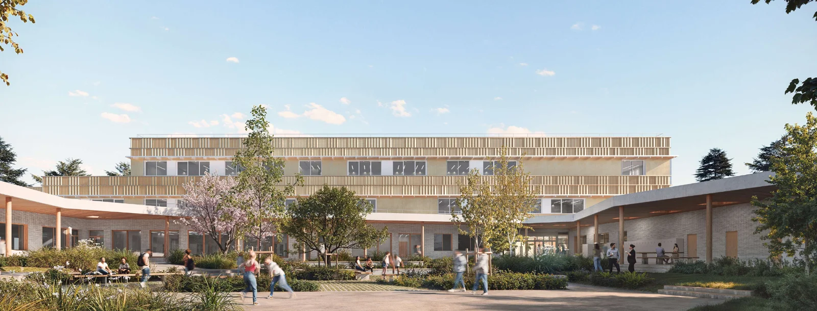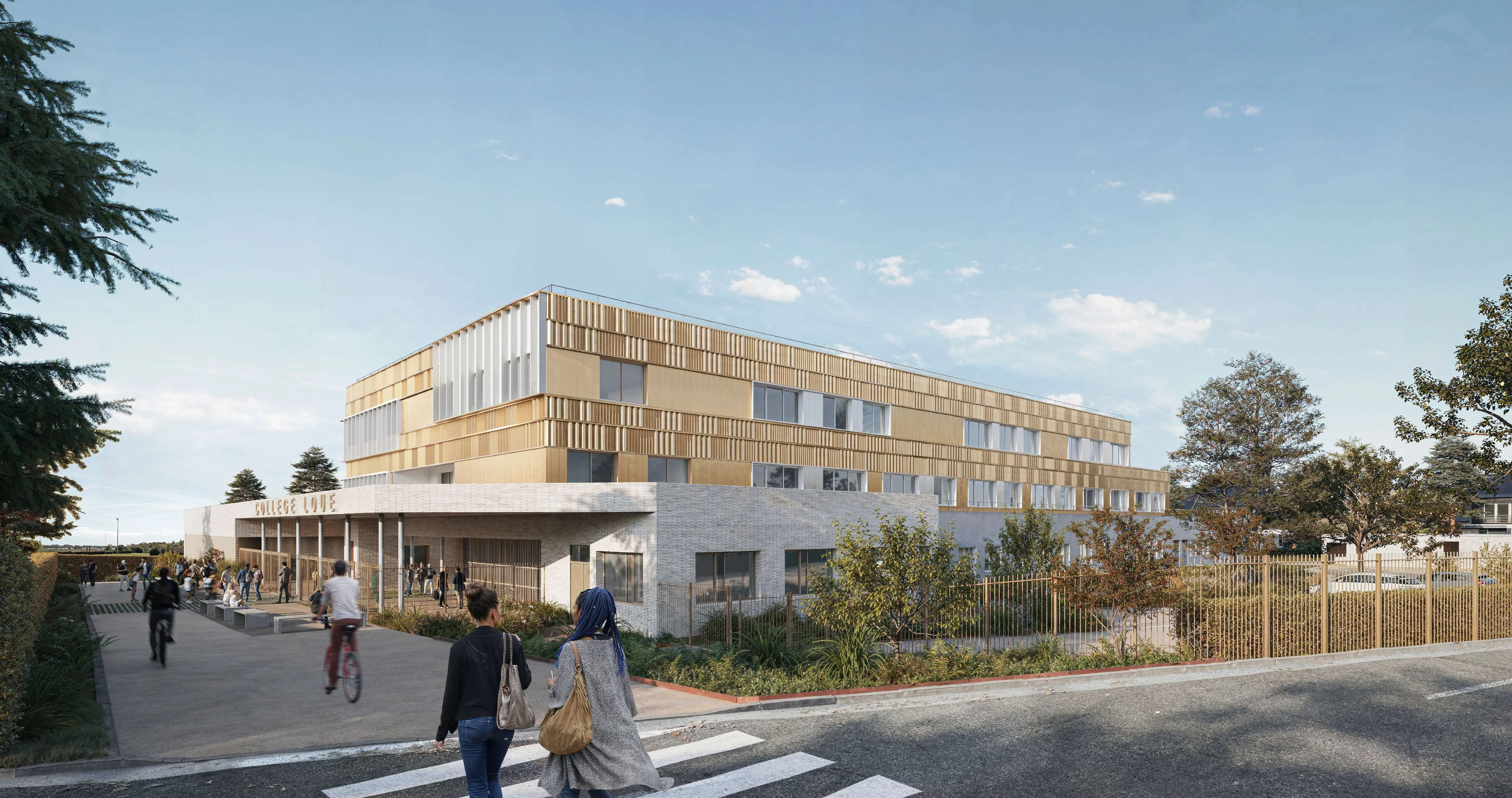 Le futur collège de Loué est un bâtiment contemporain et durable, pensé pour s’intégrer harmonieusement au paysage et marquer l’entrée de la ville. Son socle en briques claires, partiellement issues du réemploi, assure robustesse et facilité d’entretien, tandis que les étages en bois et métal doré offrent une identité architecturale forte et chaleureuse.