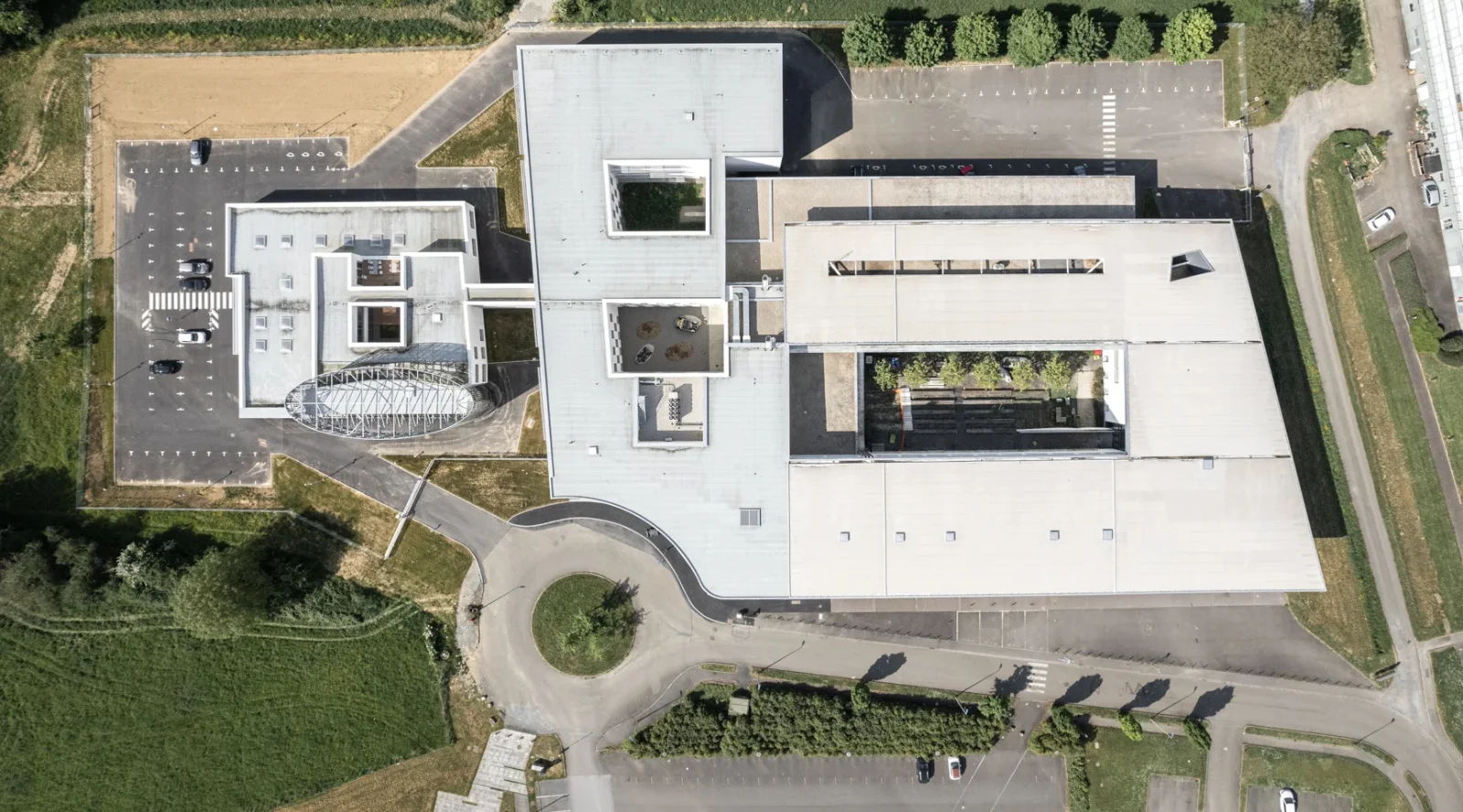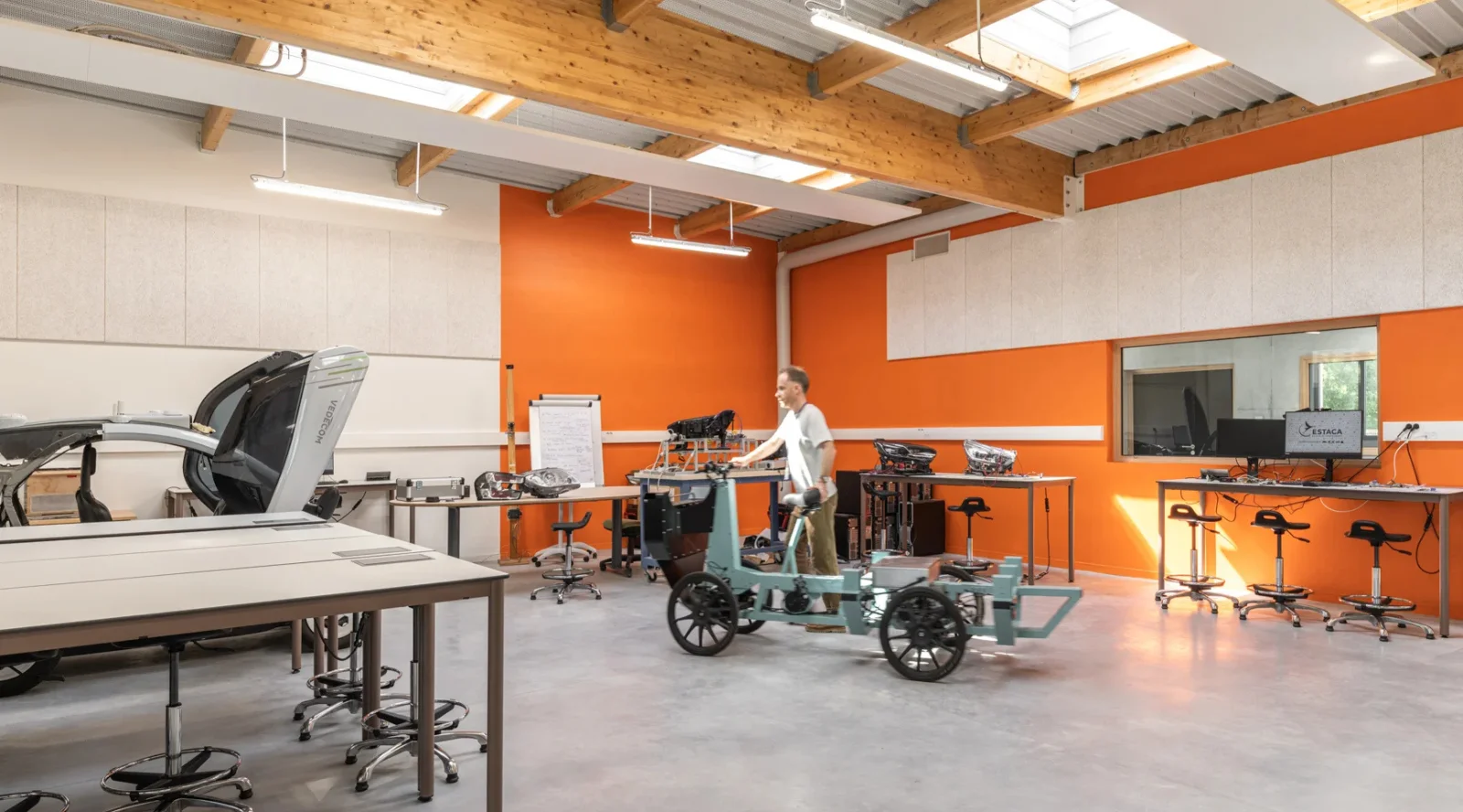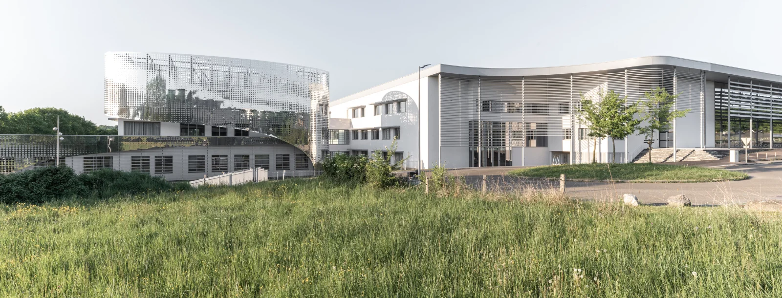 L’identité du projet s’inspire des disciplines d’enseignement de l’ESTACA propres à la mobilité. La rotation des moteurs matérialisés par l’ellipse, le métal finement perforé et profilé, référencent les carrosseries aérodynamiques des mobilités du futur. Le bâtiment Recherche, par ses formes courbes et fluides symbolise l’innovation. L’écriture architecturale du bâtiment Enseignement s’inscrit dans la continuité de l’existant annonçant, par sa toiture courbe, l’innovation portée par le nouveau pôle de recherche. La visibilité de l’école, depuis le rond-point, exprime la nouvelle image de l’ESTACA dès l’arrivée sur le site.